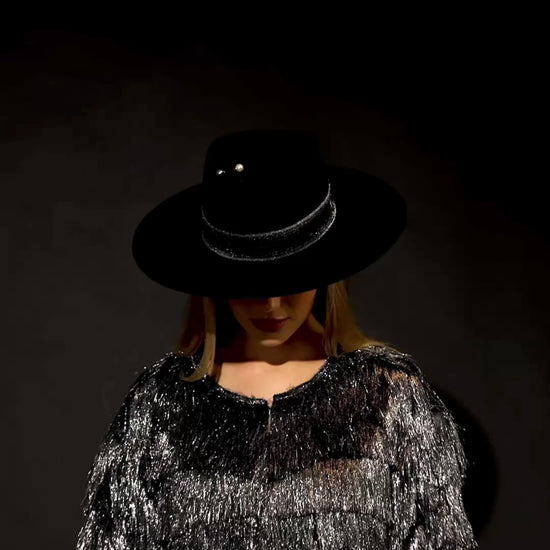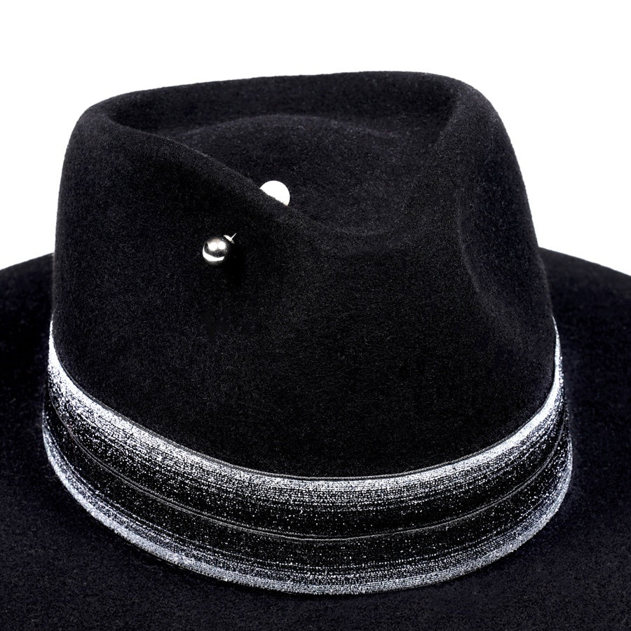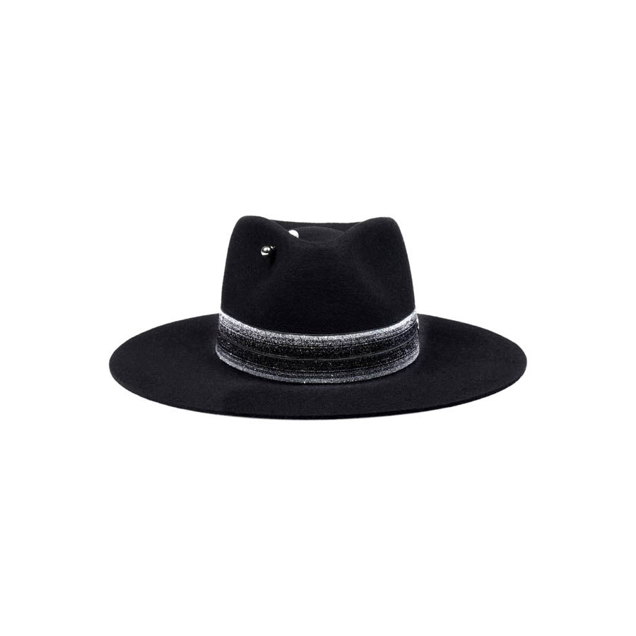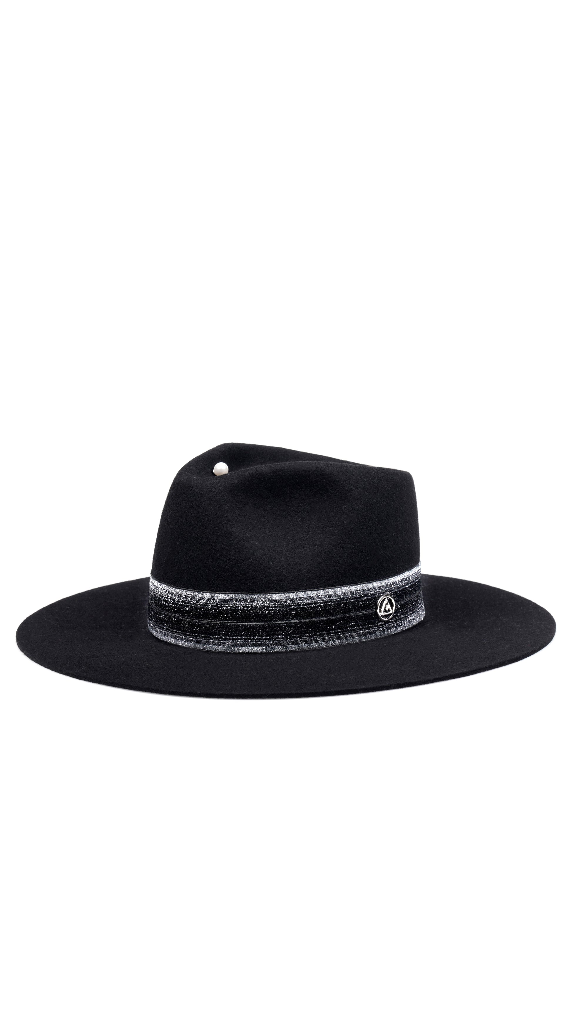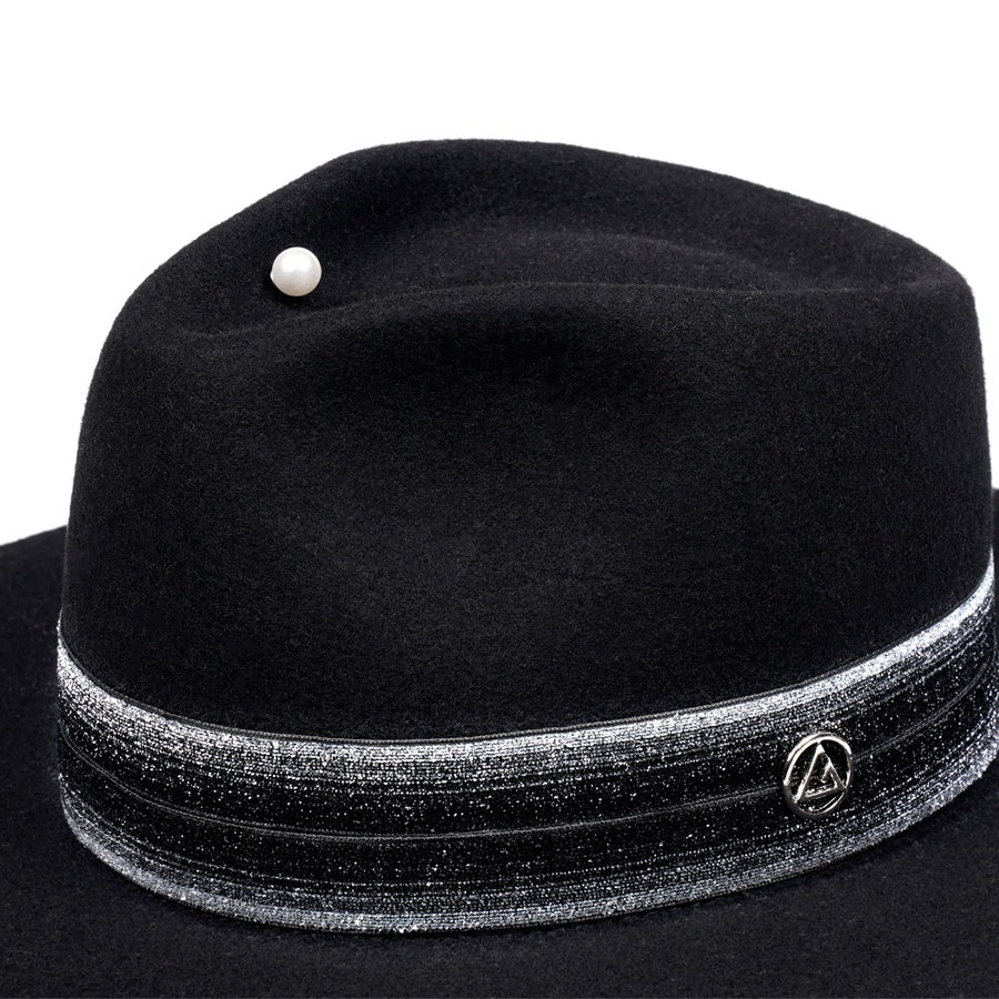 The piece is adorned with a 4 cm-wide lurex ribbon in shades of black and silver, adding just the right touch of sparkle. On the side, the hat features Le Trap’s signature silver-toned pin in nickel-free Zamak — a subtle mark of elegance.