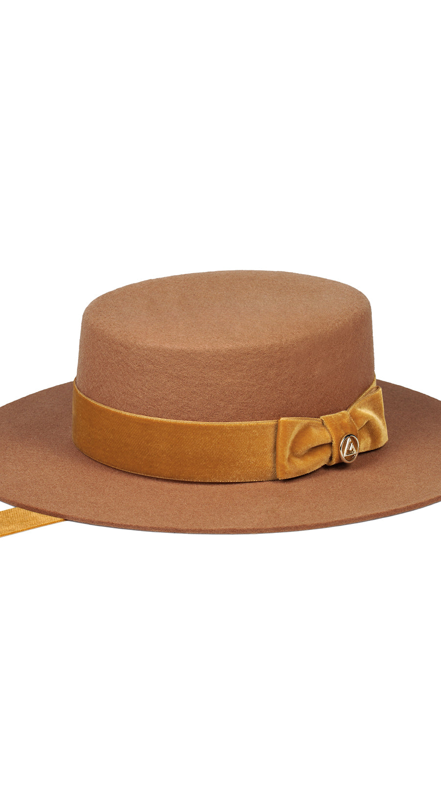 Its timeless design is given a romantic twist with a 3.8 cm wide velvet ribbon in the same shade as the hat, tied into a delicate bow and adorned with our exclusive gold-tone Zamak pin, nickel-free.