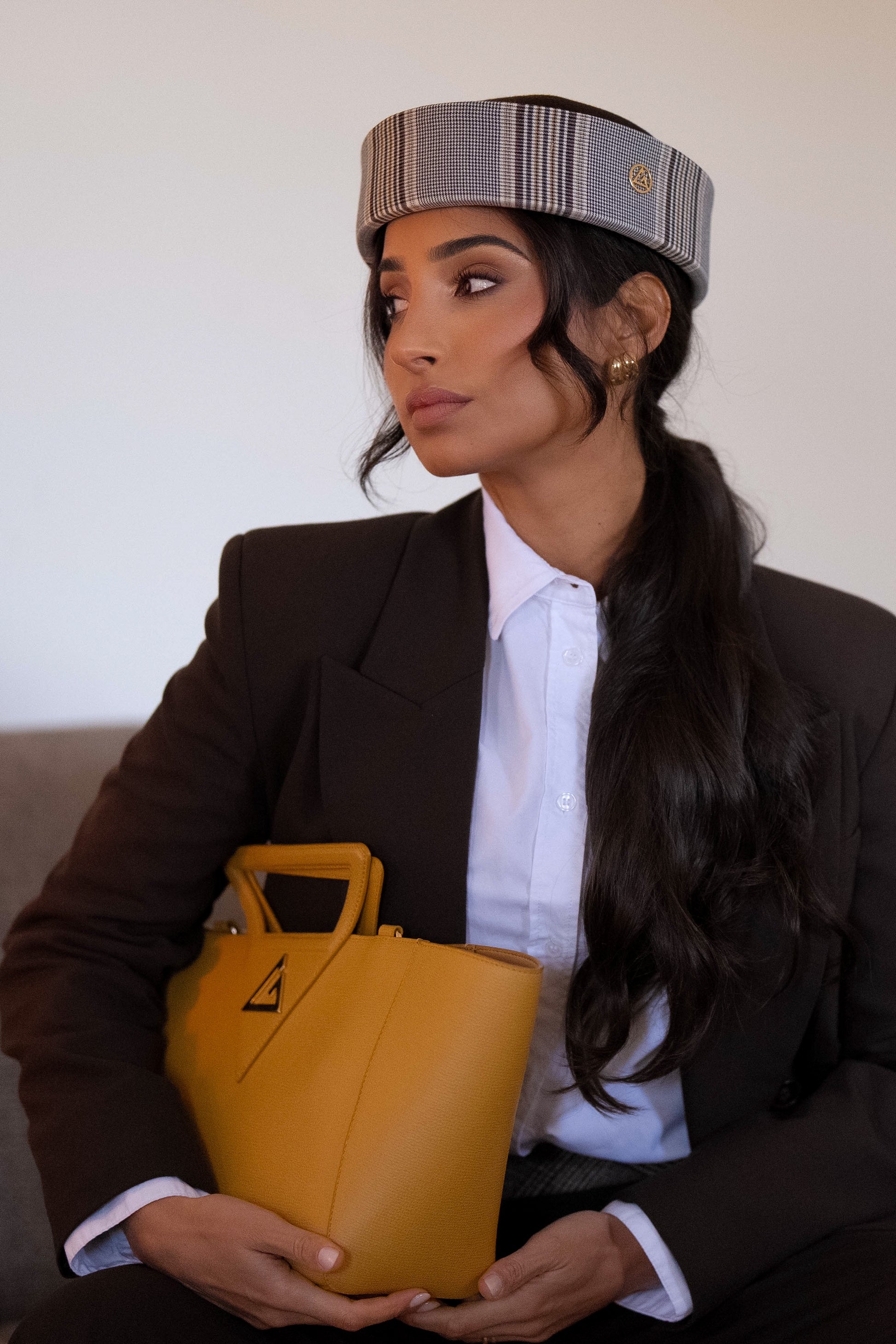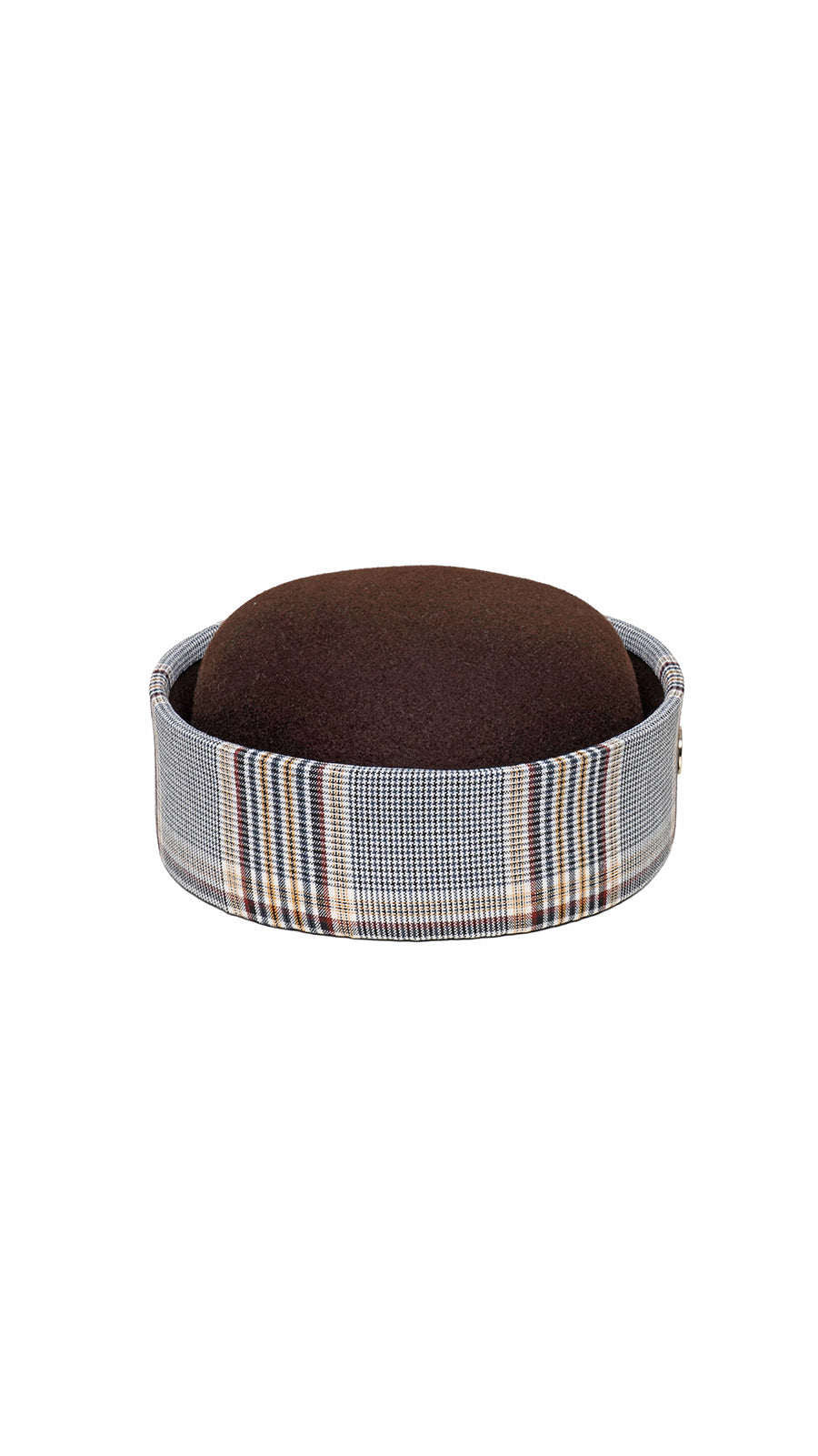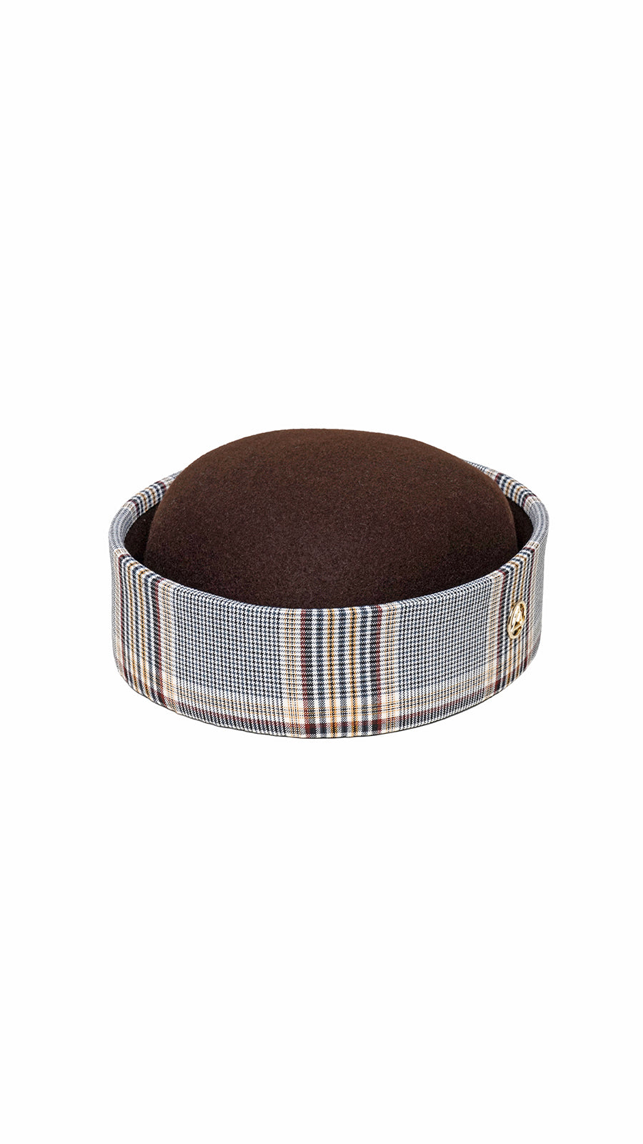 The contrast between the warm wool and the festive tartan creates a sophisticated piece full of personality — ideal for the most enchanting season of the year. The pillbox’s signature cylindrical silhouette sits lightly atop the head, flattering the face and adding a cinematic touch to December outfits. On the side, the gold Le Trap pin (Zamak, nickel-free) reinforces the brand’s luxurious attention to detail.