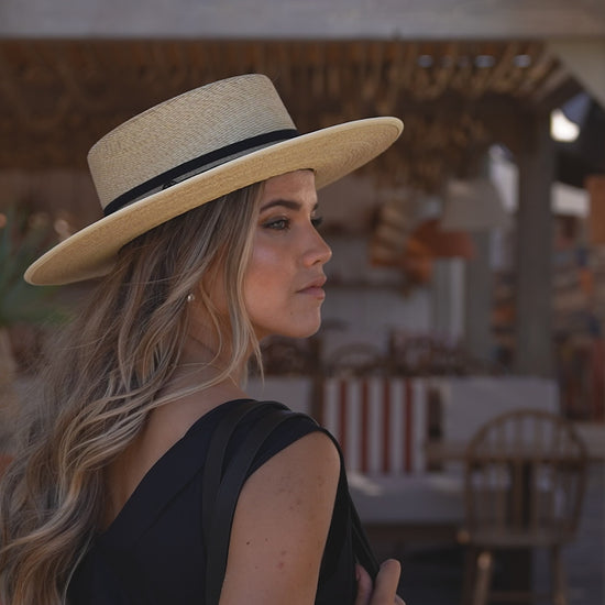 Este chapéu modelo Boater, na cor natural da palha, é cuidadosamente fabricado à mão com a prestigiada Palma Imperial do México — uma das fibras naturais mais nobres e resistentes do mundo.