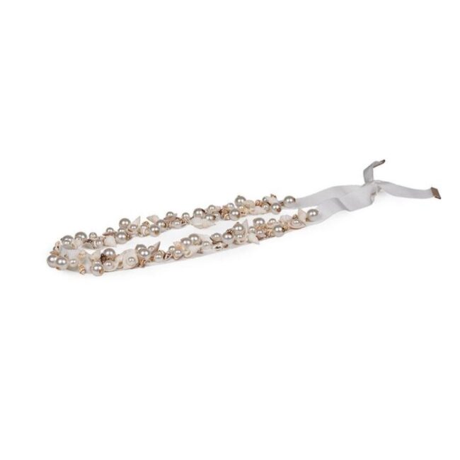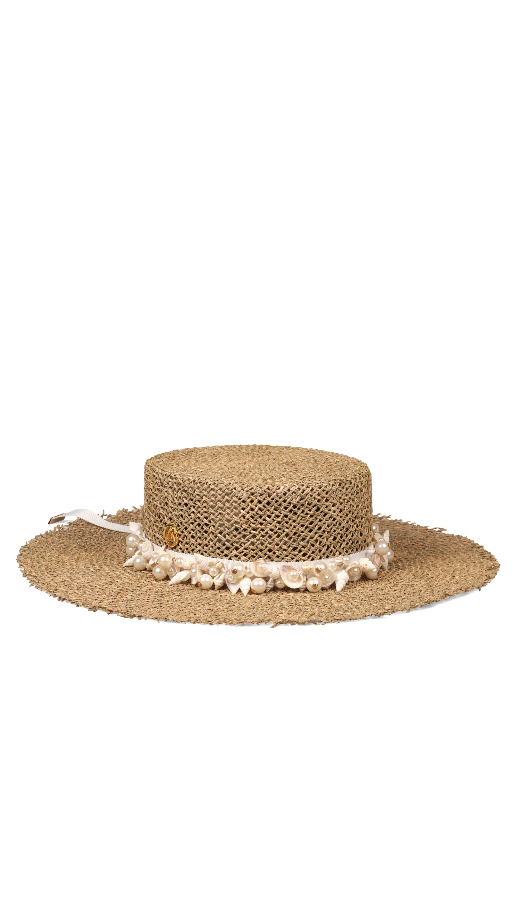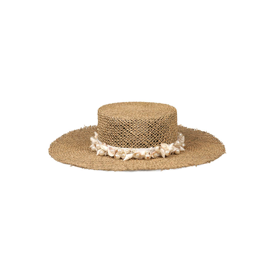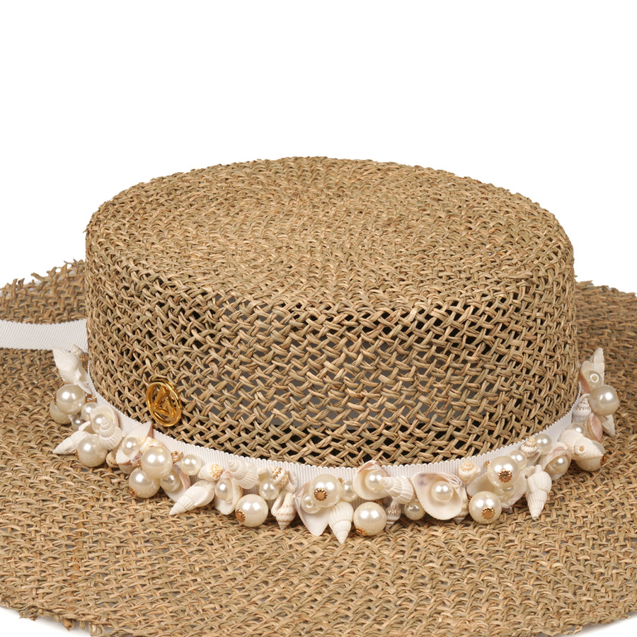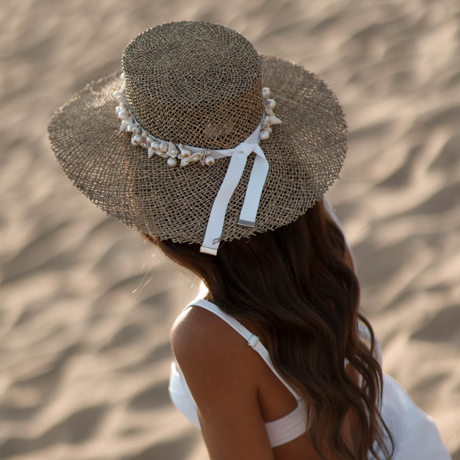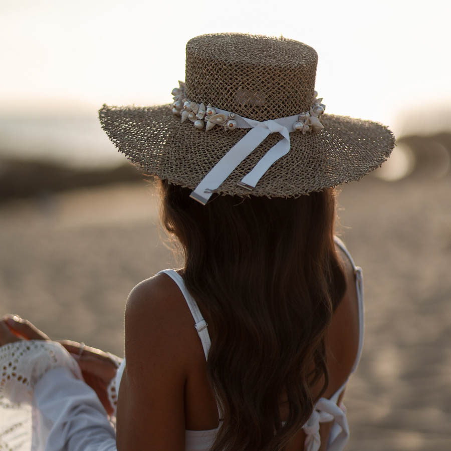 O destaque da peça é a fita branca, bordada à mão com conchas, búzios e pérolas, finalizada com ponteiras douradasem ambas as extremidades. Um verdadeiro trabalho manual que celebra o verão com sofisticação.